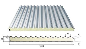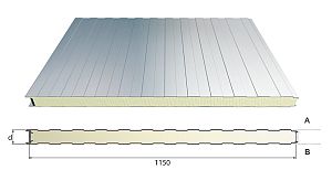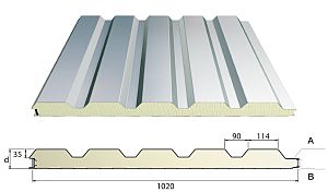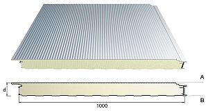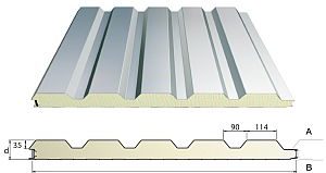 Sandwich panelen zijn opgebouwd uit twee vlakke of geprofileerde metalen platen, termisch verzinkt als basis en voorzien van een polyester coating (laagdikte aan de binnenkant 15 µm en buiten 25µm)